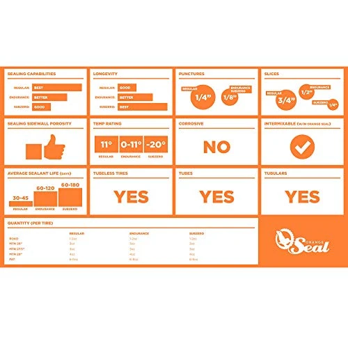 Endurance tire sealant, it’s formulated to maximize longevity; enabling riders to go longer between top-offs. All while offering the same quick sealing properties you’ve come to expect from Orange Seal.Whether you’re a beginner, expert, or somewhere in-between you will benefit from its proven ability to last up to three times longer. It is proven to seal large punctures up to 1/4″ and perform under varying temperatures and altitudes. Orange Seal Tubeless Tire Sealant is compatible with most bike tire systems and is eco-friendly. Orange Seal developed their new Orange Seal Injection System for easy sealant injection. Endurance formula outlasts the standard formula for seal after seal Includes Orange Seal injector system Performs in temperatures down to zero degrees fahrenheit Seals punctures up to 1/8″, and slices up to 1/2″ with the use of Nanites Safe to use with all tube and tubeless tires Lasts between 60 – 120 days