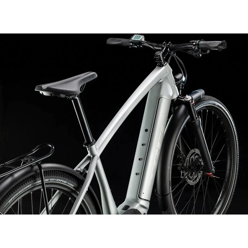 - The tech you get: A sleek, high-performance, hydroformed aluminum frame with a stagger geometry that fully encases a long-life 500Wh battery; an ultra-powerful Bosch Performance Speed drive system that helps you sustain speeds of up to 28 mph; and a Purion controller. Plus, an SR Suntour suspension fork with a lockout feature, a 9-speed Shimano Alivio drivetrain, powerful 4-piston hydraulic disc brakes for all-weather stopping power, an integrated front and rear lighting system, fenders, and a rear rack.