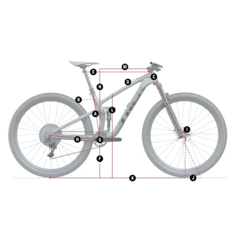 | Frame size number | Frame size letter | Geometry position | Wheel size | A — Seat tube | B — Seat tube angle | Effective seat tube angle | C — Head tube length | D — Head angle | E — Effective top tube | F — Bottom bracket height | G — Bottom bracket drop | H — Chainstay length | I — Offset | J — Trail | K — Wheelbase | L — Standover | M — Frame reach | N — Frame stack |