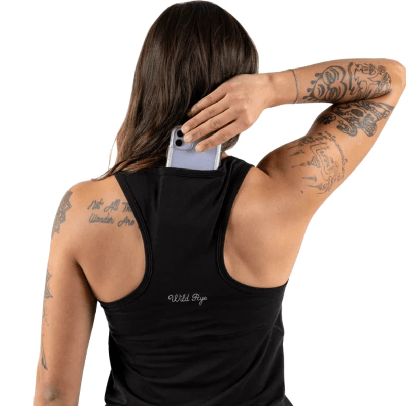 The racerback tank is a staple in an active woman’s closet. With the Mia Tank, Wild Rye has taken everything you love about the classic racerback and improved it. With a looser fit, you can stop pulling at your tank and get back to riding. Made with a temperature-regulating merino blend, the Mia is a versatile racerback designed for mountain biking, but ready to take you anywhere on the mountain. Plus, it features a hidden pocket in the back, large enough to fit an iPhone plus!